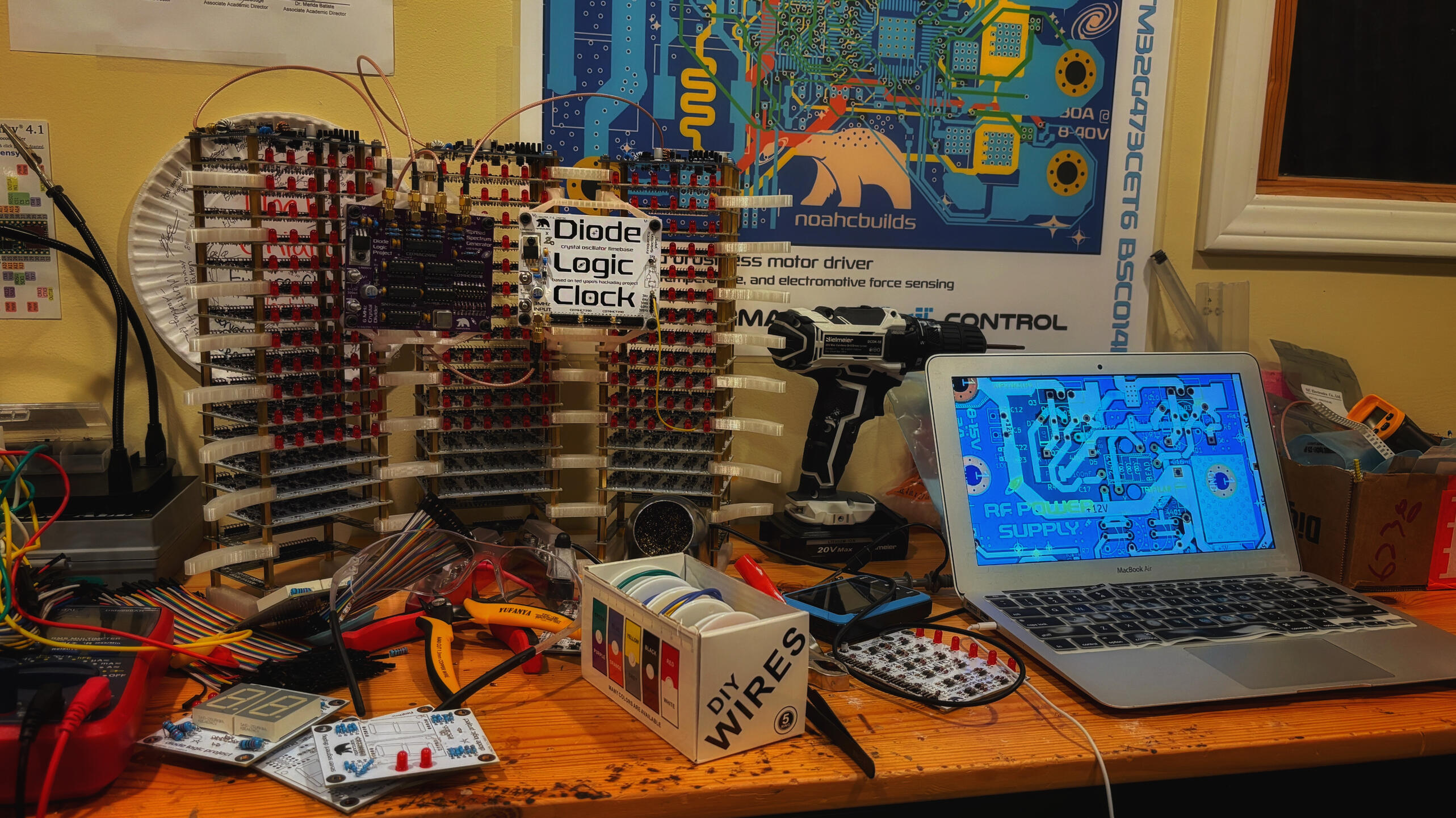 After building TenniBear, I wanted to work on something purely electronic. While browsing Hackaday, I found Ted Yapo’s Diode Clock. The clock stood out to me for the wide range of electronics involved and the complexity. I predicted building the clock would keep me occupied for months and teach me more about electrical engineering. After a few days of poring over Yapo's project logs, I committed to building his clock with some redesigns.The clock is built around diode logic boards (mine uses 48, while Yapo’s uses 46, for reasons I’ll show later). The top left is design is his. To the right is mine, with fewer through-hole components and thicker traces. Manual assembly/soldering time was reduced from around 1 hour/board (for Yapo’s design) to 15 minutes. Using JLCPCB instead of OSH Park (Yapo's supplier) reduced prices from $20/board to $4/board.The board consists of six NOR gates each made of diodes, capacitors, resistors, and inductors. The board is reconfigurable as a data flip flop or 3 set-reset latches. The red LEDs display output state. Powered with 5V DC and 12Vp-p RF supplied by custom power supply (next slide).