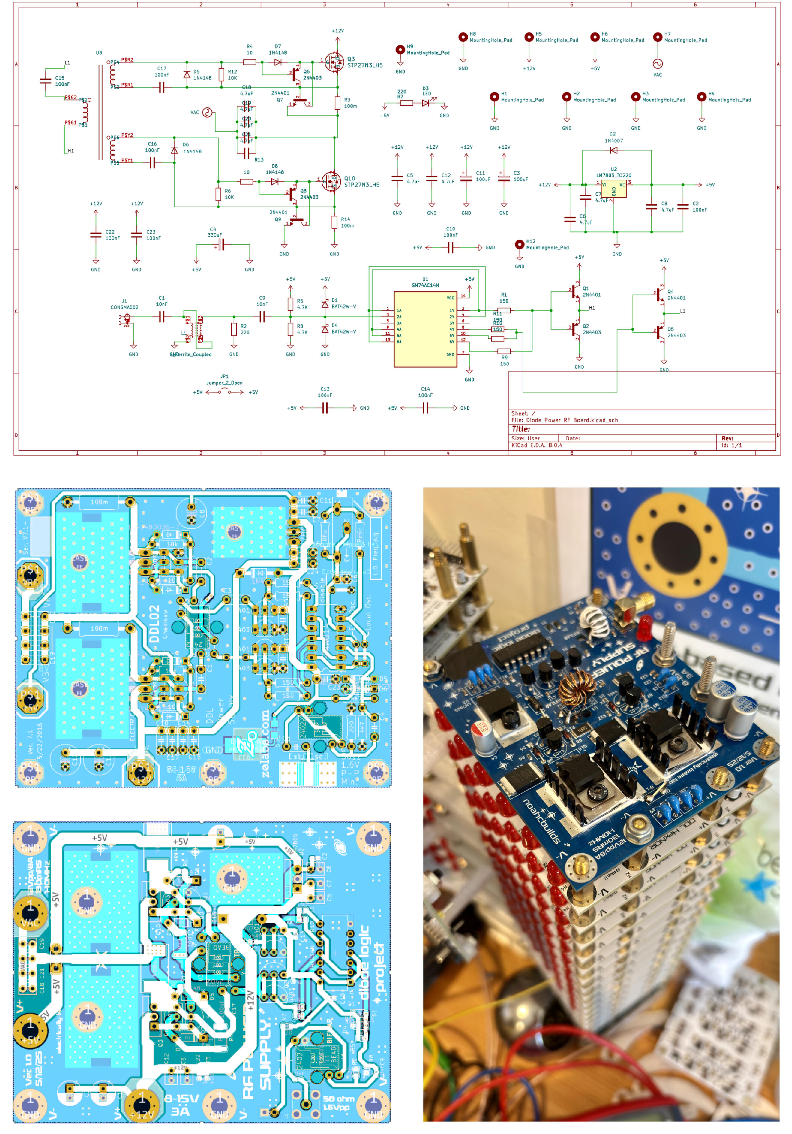 Yapo’s diode logic NOR gates require an RF power source (middle left), which allows for signal inversion (DC bias from inputs inversely determining whether RF current is shunted to ground via diodes, resulting in a low output, or blocked and allowed to continue, producing a high output). Bottom left is my redesign, with the local oscillator section removed. Crucially, the aluminum organic polymer caps Yapo used for input noise filtering were no longer manufactured. I found my own with similar equivalent series resistance (ESR) and ripple current values. I also increased the power rating of the current-limiting resistors (R3 and R14 in schematic).Assembly of the switching MOSFETs was delicate, with layers of insulation, thermal grease, and heatsinks. Bottom right is a picture of an assembled power supply on top of a stack of logic boards. Three of these “logic stacks” make up my version of the clock.