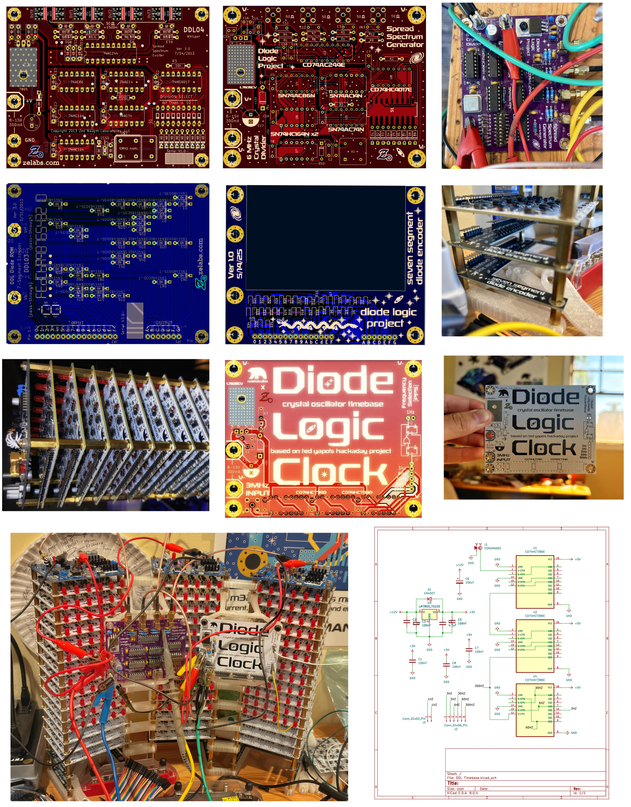 Top pictures depict the external oscillator used for the power supply input signals. I kept this board mostly identical to Yapo’s, except for some footprints (SMA jack, crystal). The board provides 3 MHz signals to 4 RF power supplies, reducing EMI by keeping them in opposite phases. I condensed my clock to 3 power supplies which reduced the anti-EMI effectiveness, but I compensate using an RC snubber across the supply outputs.Below the spectrum generator is a diode encoder for 7-segment displays (the display boards I have yet to make). The bright red board is my self-designed timebase, dividing the 4th output of the spectrum generator (3 MHz) down to 1 Hz (clock source). I chained three 4-bit decade counter ICs in series to get from 3 MHz to 3 Hz. To get from 3 Hz to 1 Hz, I use two D flip flops and an extra NOR gate (reason for needing 48 logic boards instead of 46). Bottom right is the schematic of the timebase, and bottom left are my three “logic stacks” with the spectrum generator and timebase.
