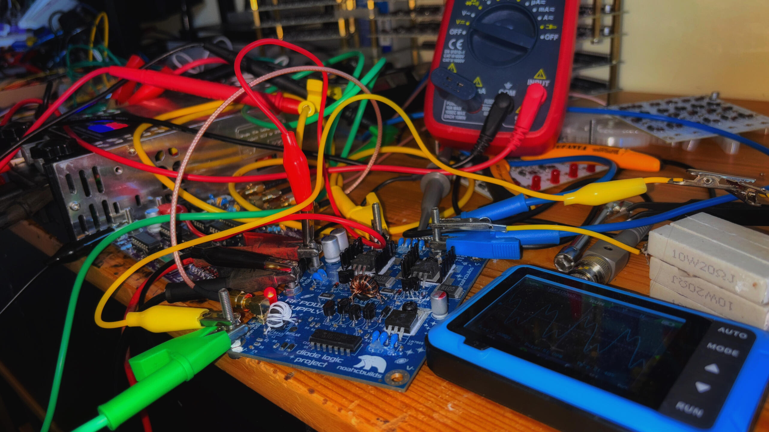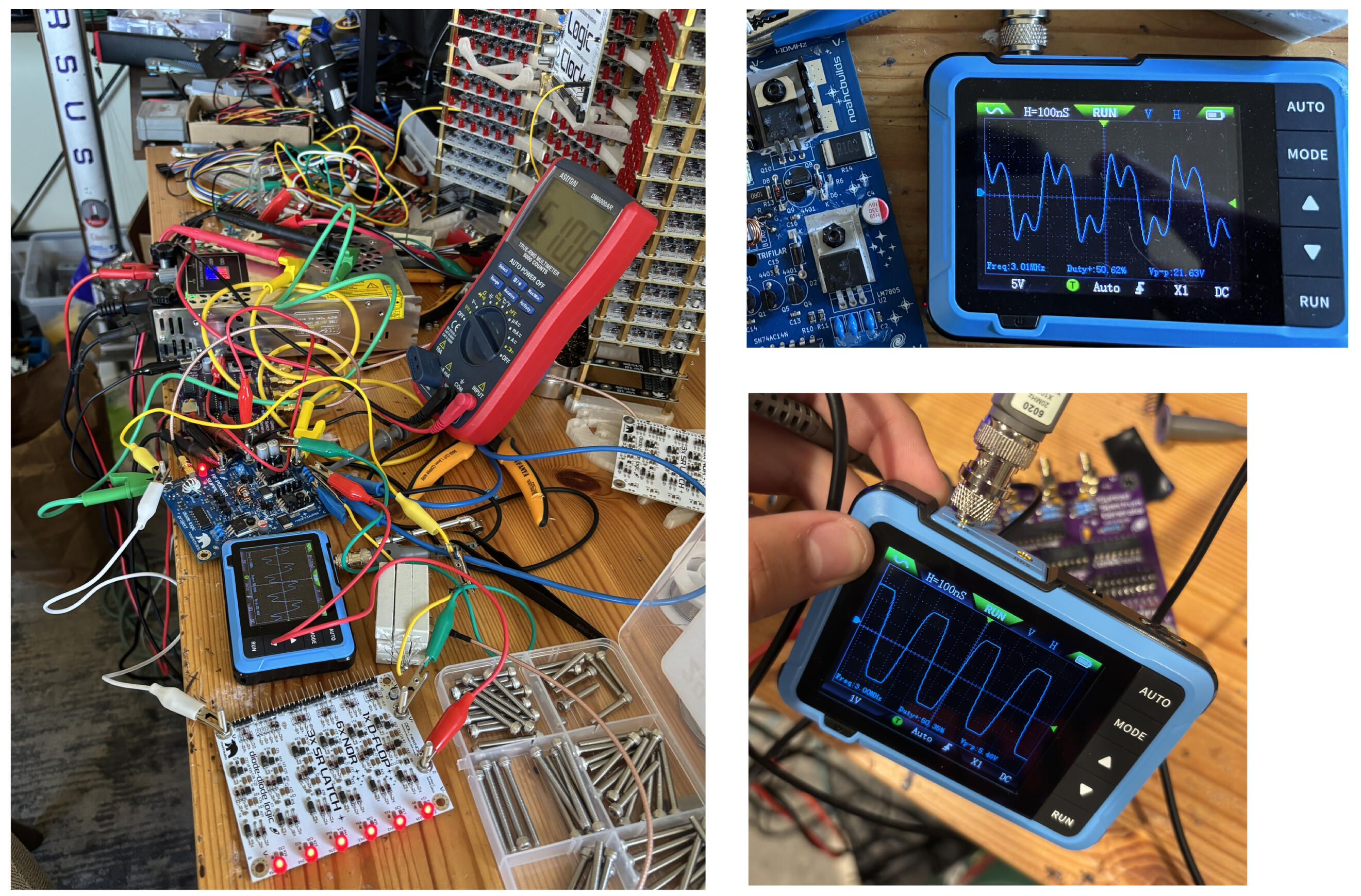 After finishing assembly of the signal generator and power supply, I needed to verify their performance. My school didn’t have an oscilloscope, so I bought a cheap handheld one off Amazon.Bottom right is the output of the signal generator, a clean 3 MHz 5.5Vp-p square wave. I fed this into the RF power supply, obtaining the upper right waveform with a 2.2 ohm dummy load (nine 20-ohm resistors in parallel, which I measured from my logic stack to be a good model of the load). The result contained 22V spikes and 12Vp-p averages. These spikes are within my MOSFETs’ 30V limit, although my oscilloscope’s 10 MHz sampling rate makes it hard to be sure. I’ve since decreased the amplitude of the ringing using a 220pF/10 ohm snubber (values suggested by Yapo that worked great for me). MOSFET temperature stabilized around a satisfactory 35C. Left picture is the verification of logic gates (all on because I left inputs floating).