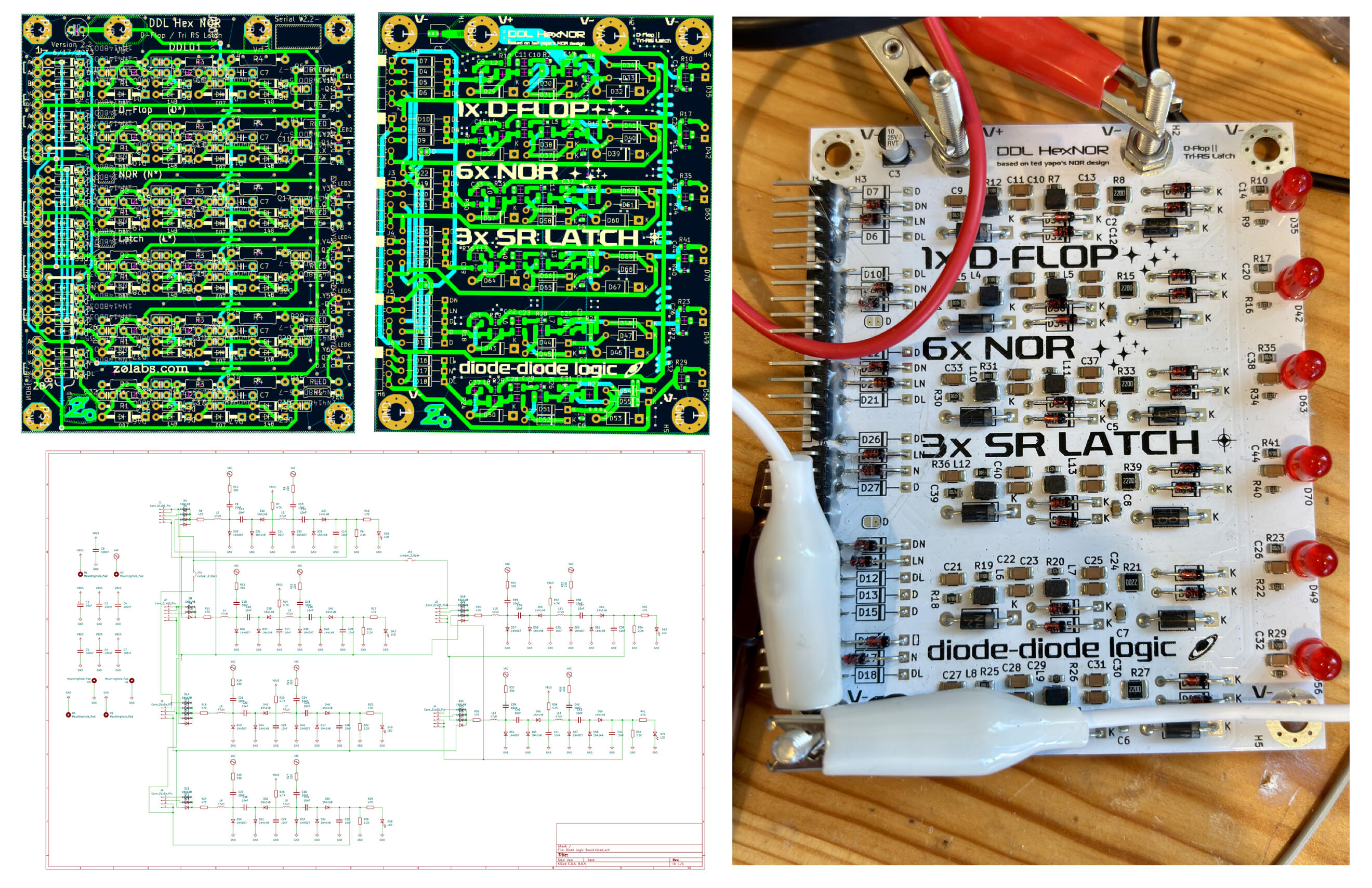 After building TenniBear, I wanted to work on something purely electronic. While browsing Hackaday, I found Ted Yapo’s Diode Clock. The clock stood out to me for the wide range of electronics involved and the complexity. I predicted building the clock would keep me occupied for months and teach me more about electrical engineering. After a few days of poring over Yapo's project logs, I committed to building his clock with some redesigns.The clock is built around diode logic boards (mine uses 48, while Yapo’s uses 46, for reasons I’ll show later). The top left is design is his. To the right is mine, with fewer through-hole components and thicker traces. Manual assembly/soldering time was reduced from around 1 hour/board (for Yapo’s design) to 15 minutes. Using JLCPCB instead of OSH Park (Yapo's supplier) reduced prices from $20/board to $4/board.The board consists of six NOR gates each made of diodes, capacitors, resistors, and inductors. The board is reconfigurable as a data flip flop or 3 set-reset latches. The red LEDs display output state. Powered with 5V DC and 12Vp-p RF supplied by custom power supply (next slide).