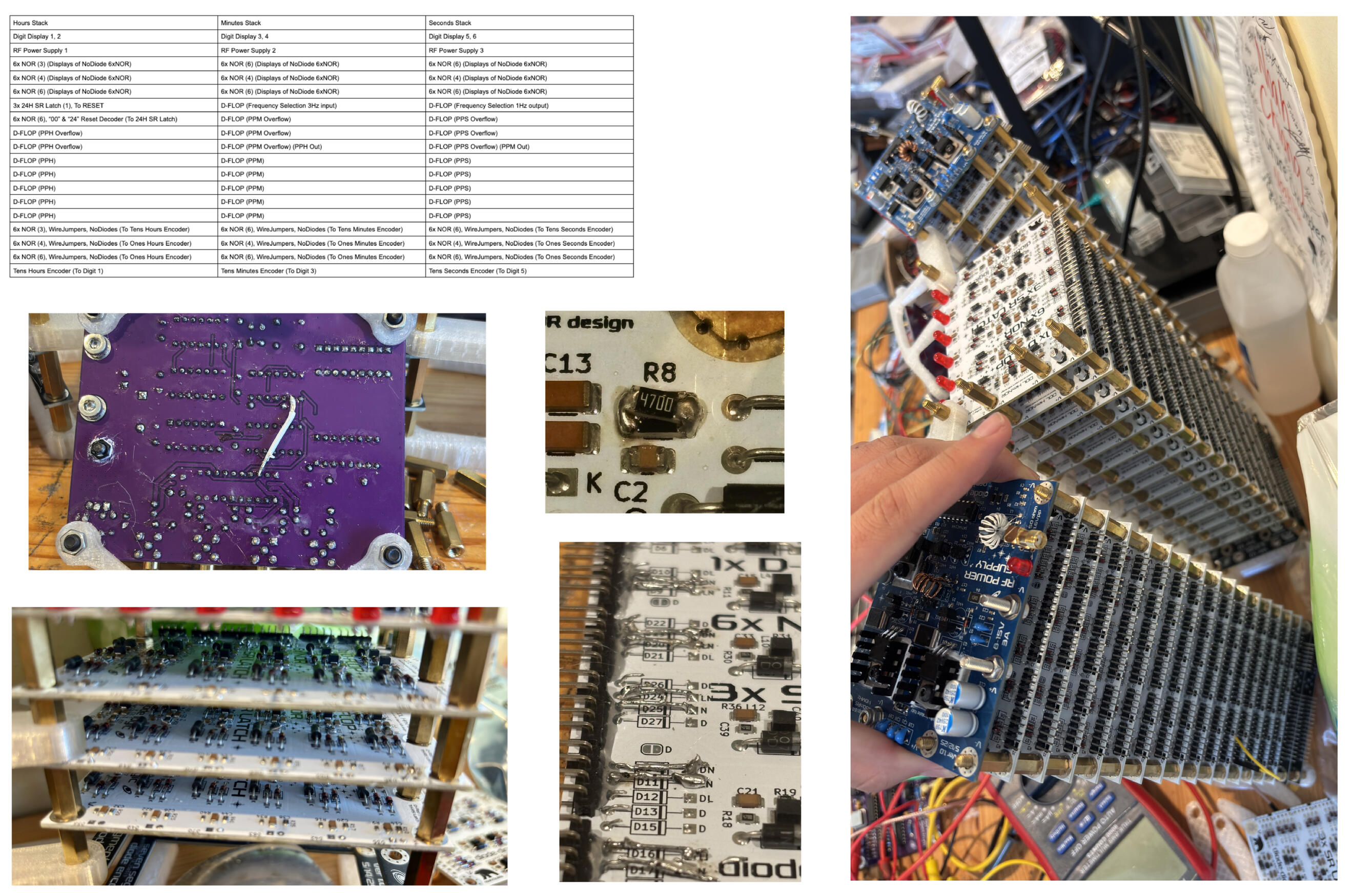I still need to verify frequency divisor performance, build 7-segment displays, and wire everything up and test (via the pin headers on the back of the clock).I created my own logic board configuration guide to wire and stack 48 boards (top left). I removed redundant input protection diodes and LED outputs on the boards driving the diode encoders (bottom left and middle pictures). I increased output power for these boards as well by decreasing resistance between RF power and output (stacking another resistor on top of R8; middle picture). I debugged issues during assembly, like a missed connection on the purple signal generator, blown MOSFETS on the RF power supply, and faulty diodes on some of the logic boards.I now have a better understanding of discrete circuits, basic logic, and low MHz RF systems. I’m thankful to Yapo for putting his project on Hackaday, and I’m excited to continue building.